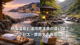 熱海温泉と湯河原温泉の違いを徹底比較。アクセス・雰囲気・宿の特徴・食事・泉質までやわらか丁寧に解説。週末1泊2日のカップル旅行でどちらを選ぶべきか分かります。